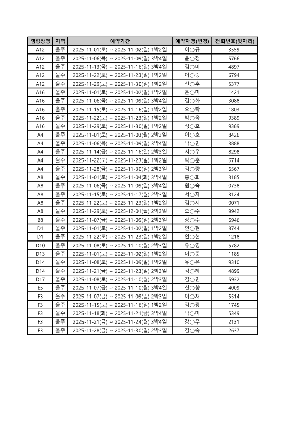 2025년 11월 1차 울주군민 우선추첨 당첨자 명단입니다. 10월 05일 13:00시 전까지 결제 완료 하셔야 예약 확정이 됩니다. 반드시 시간 전에 결제 해주셔야 예약이 완료되며, 공지확인을 하지 않아 미결제로 예약이 취소되는 경우에는 복구가 불가합니다. 궁금하신 사항이 있으시면 유선 상으로 문의 부탁드립니다.