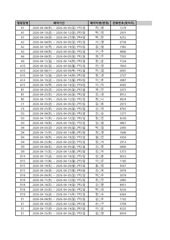 2026년 4월 3차 잔여석 당첨자 명단입니다. 3월 13일 13:00시 전까지 결제 완료 하셔야 예약 확정이 됩니다. 반드시 시간 전에 결제 해주셔야 예약이 완료되며, 공지확인을 하지 않아 미결제로 예약이 취소되는 경우에는 복구가 불가합니다.