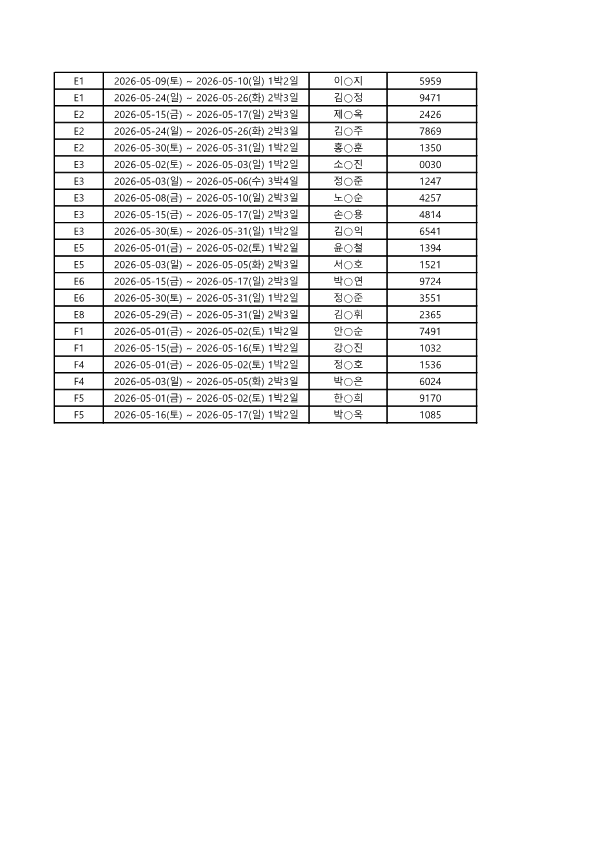 2026년 5월 3차 잔여석 추첨 당첨자 명단입니다. 4월 13일 13:00시 전까지 결제 완료 하셔야 예약 확정이 됩니다. 반드시 시간 전에 결제 해주셔야 예약이 완료되며, 공지확인을 하지 않아 미결제로 예약이 취소되는 경우에는 복구가 불가합니다. 궁금하신 사항이 있으시면 유선 상으로 문의 부탁드립니다.