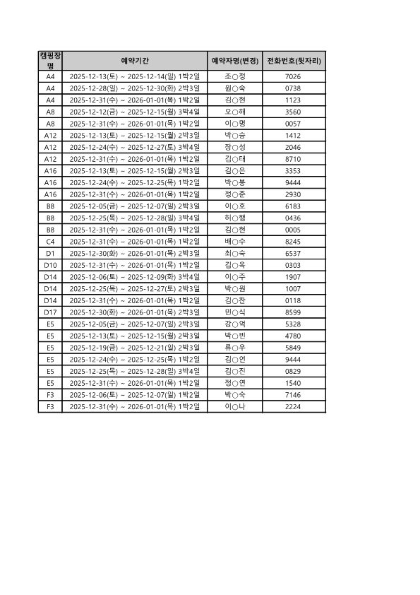 2025년 12월 1차 잔여석추첨 당첨자 명단입니다. 11월 05일 13:00시 전까지 결제 완료 하셔야 예약 확정이 됩니다. 반드시 시간 전에 결제 해주셔야 예약이 완료되며, 공지확인을 하지 않아 미결제로 예약이 취소되는 경우에는 복구가 불가합니다. 궁금하신 사항이 있으시면 유선 상으로 문의 부탁드립니다.