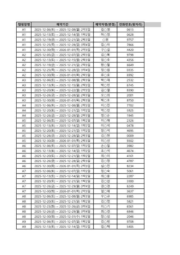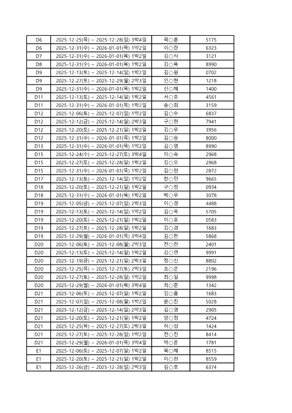 2025년 12월 2차 일반추첨 당첨자 명단입니다. 11월 09일 13:00시 전까지 결제 완료 하셔야 예약 확정이 됩니다. 반드시 시간 전에 결제 해주셔야 예약이 완료되며, 공지확인을 하지 않아 미결제로 예약이 취소되는 경우에는 복구가 불가합니다. 궁금하신 사항이 있으시면 유선 상으로 문의 부탁드립니다.