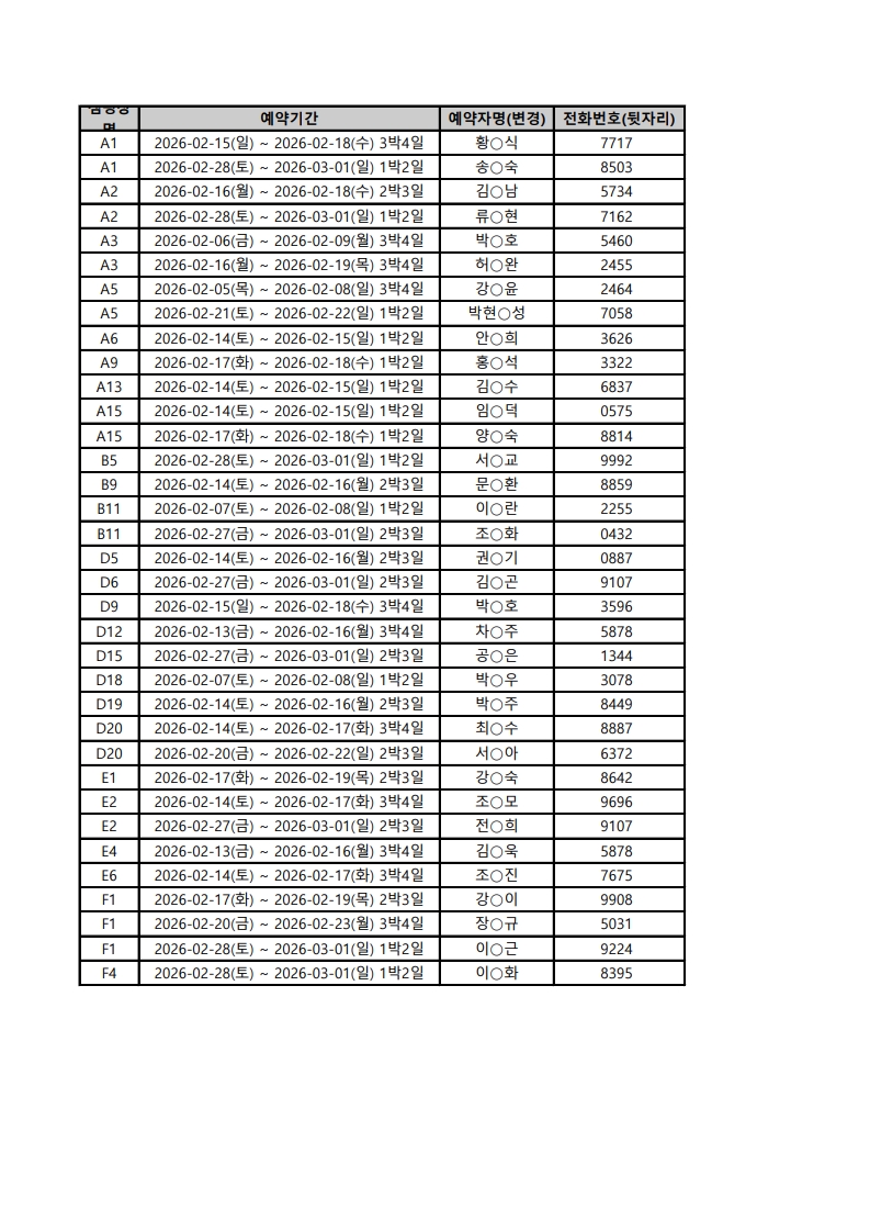 2026년 2월 3차 잔여석 추첨 당첨자 명단입니다. 01월 13일 13:00시 전까지 결제 완료 하셔야 예약 확정이 됩니다. 반드시 시간 전에 결제 해주셔야 예약이 완료되며, 공지확인을 하지 않아 미결제로 예약이 취소되는 경우에는 복구가 불가합니다. 궁금하신 사항이 있으시면 유선 상으로 문의 부탁드립니다.